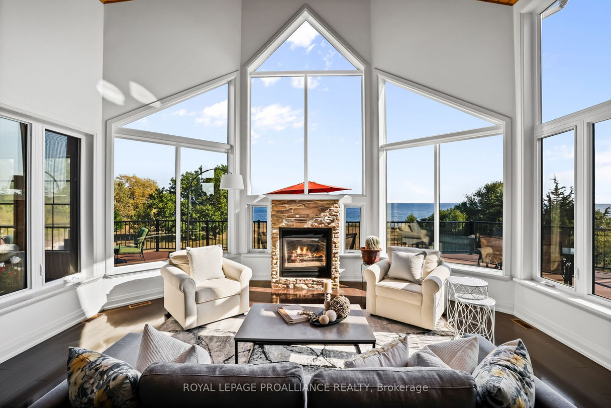 PARADISE ON 180 ft OF PRISTINE LAKE ONTARIO WATERFRONT! 263 Lakeshore Road, Brighton-This executive waterfront residence on nearly 3acres of privacy with 4 Bed and 6 Bath, less than an hour from the GTA, blends modern elegance with natural beauty, creating a true entertainer's paradise. Enjoy sprawling outdoor spaces, uninterrupted shoreline vistas & tranquil mornings by the water's edge. Host unforgettable gatherings against shimmering sunsets, or relax in serene luxury. The main floor features ceiling-to-floor windows framing panoramic lake views, flooding the great room with light. Striking gas fireplace anchors the space, while the open-concept design flows effortlessly into the chef-inspired kitchen and dining area, seamlessly connecting to the screened-in sunroom and expansive composite deck. A versatile wing offers a spacious area ideal for an in-law suite or games and entertainment lounge, complete with a 3-pc bath and separate entrance. A separate office and laundry room complete the main floor. Upstairs, the Primary suite is a private sanctuary with a Juliette balcony overlooking the water...perfect for evening wine under the stars, spa-inspired ensuite with double walk-in shower and massive WI closet. A two-sided fireplace connects the suite to the loft, adding warmth and architectural drama. 3 additional bedrooms provide ample space for family or guests. The lower level offers a walkout to a covered patio, extending living space outdoors. Thoughtful features include a kitchenette in Rec room, cold storage, dog run & pet grooming mud room plus direct access to the double car garage-ideal for both convenience and functionality. Efficient geothermal heat/cool system. Minutes from amenities, marinas, conservation parks, shopping, waterfront dining, and a short drive to Cobourg or Prince Edward County's award-winning wineries, white sand beaches & acclaimed restaurants. This isn't just a home - it's your exclusive gateway to the ultimate waterfront lifestyle!